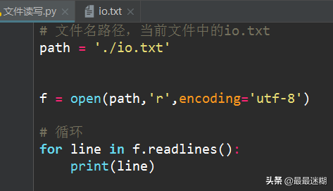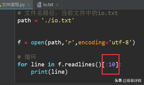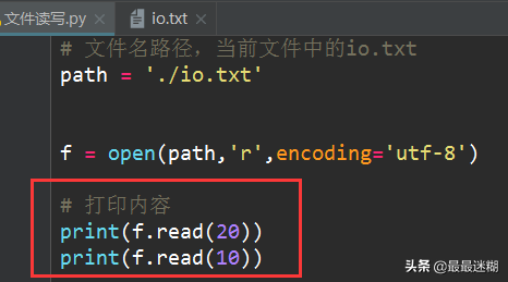 如果文件有10G,内存就爆了,所以,要保险起见,可以反复调用read(size)方法,每次最多读取size个字节的内容。