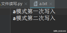第二次写入内容,a.txt已经存在,直接在第一次写入内容的后面把第二次内容写入。