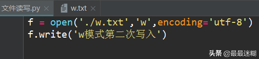 第二次写入内容,w.txt已经存在,就把第一次写入的内容删掉,再把第二次内容写入。