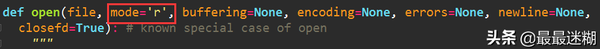 编码(encoding)推荐utf-8(也可以写成utf8)这样无论中文、英文或者混合的文件都可以读。其中打开模式mode=可以不写,直接参数。因为第一参数文件名必须,打开模式是第二参数,编码是第四参数所以不能省略。