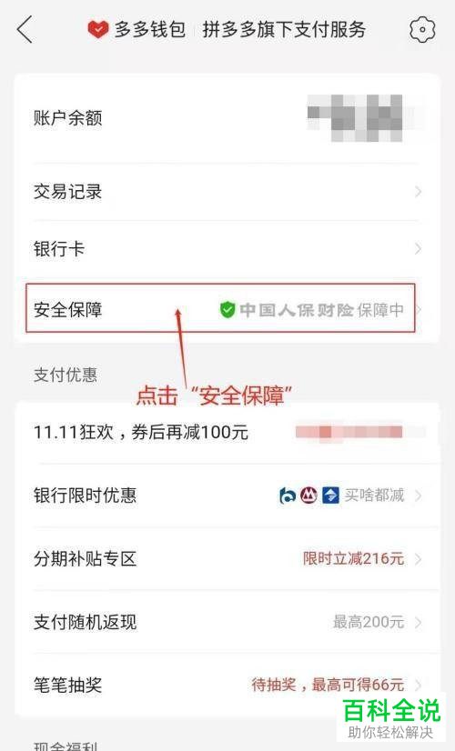 3. 第三步在【多多钱包】页面中,根据下图箭头所指,点击【安全保障】选项。