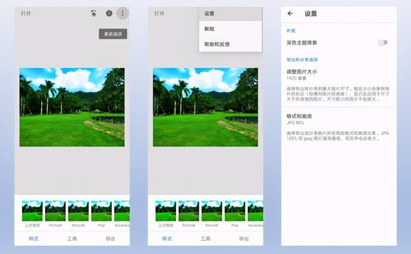 以上就设置完成了,终于到了导出的步骤了。回到主界面,点击“导出”会发现下面有三个导出的选项,这就比较懵了。那么我来介绍下这三者的区别,“保存”是以默认的尺寸、默认的压缩质量保存到默认的相册中,这个选项在苹果端和安卓端还有一些不同:苹果端会顺便保存调整的步骤,下次打开这张照片时就可以看到上次的调整并且可以继续操作(一年多以前我使用苹果的时候是这样,现在是不是我就不知道了),而安卓端就不可以;“导出”是以我们刚刚设置的那个尺寸和压缩质量保存在默认相册中;“导出为”和“导出”唯一的不同是需要自己选择存储位置,这和电脑上的“另存为”非常相似。我们只用“导出”和“导出为”这两个选项。