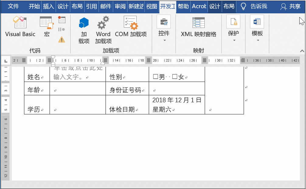 将光标定位在性别所在位置,然后点击【开发工具】——【复选框内容控件】,如果你选中之后发现是☒,这时可以选中属性,更改复选框选中的符号即可。