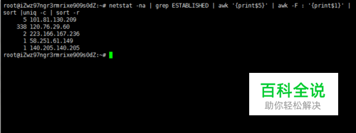 查出每个IP地址连接数 netstat -na | grep ESTABLISHED | awk '{print$5}' | awk -F : '{print$1}' |sort |uniq -c | sort -r