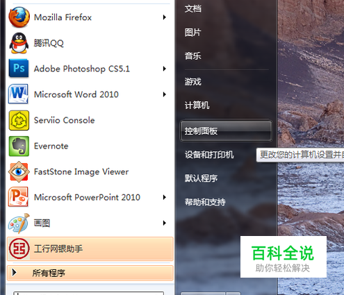 点击开始菜单→控制面板,打开控制面板。