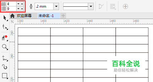 在工具箱中单击“图纸工具”,属性栏的右上角设置“图纸的行数和列数”分别为4行9列,如图所示,设置完毕后,在绘图区域拉动鼠标绘制表格。 注:使用图纸工具绘制表格只能先设定行数和列数在拖动鼠标实现表格,当表格绘制完成后更改表格行列数不会对当前表格有所影响。