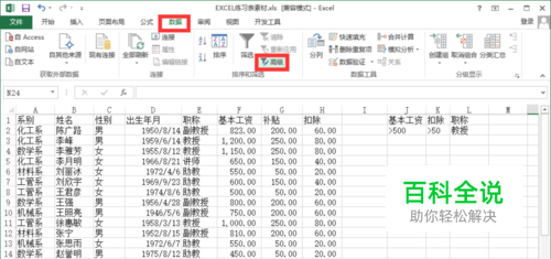 在其他单元格输入项目,例如: “基本工资”大于500,“扣除”大于50,“职称”为教师 【小贴士】 这里的“基本工资”,“扣除”,“职称”必须与原表中的完全一致,仔细检查是否有“空格“或”错别字“
