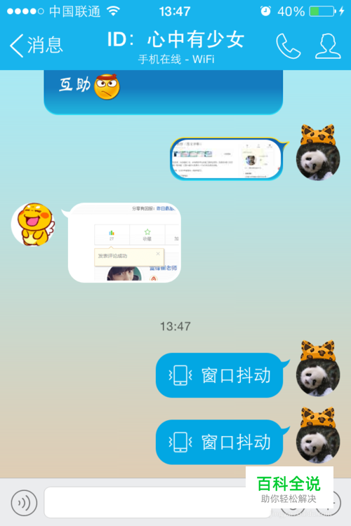 点击之后,你就会看到你和TA的聊天界面出现了“窗口抖动”的字样,而且手机有振动感哦。