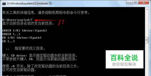 查询命令作用: 忘记了命令的作用,或者要了解该命令的用法,在命令后加/?就可以了, 例如我要查看CD命令:cd/?-如下图所示: