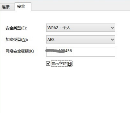 3、接下来可以打开【无线网络属性对话框】,切换到【安全】选项卡,并勾选上【显示字符】,就可以查看到网络安全秘钥,也就是Wifi密码了,如下图所示。