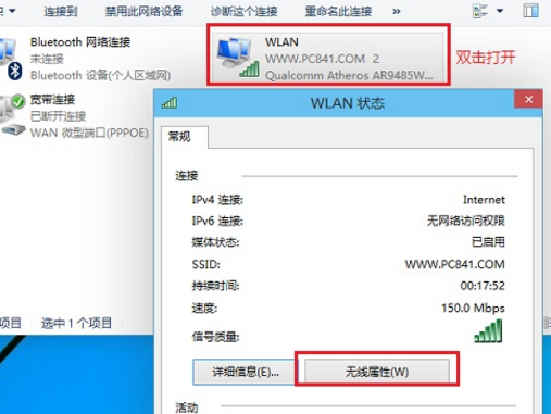 2、在打开的网络连接设置中,双击已经连接的【无线网络名称】,在弹出的【WLAN状态】对话框中,点击【无线属性】,如下图所示。