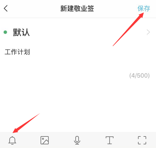 三、点击新增按钮,输入要记录的备忘记事内容,如果需要设定时间提醒,可以点击“闹钟”图标设置,记录完成后点击顶部右上角的“保存”按钮。