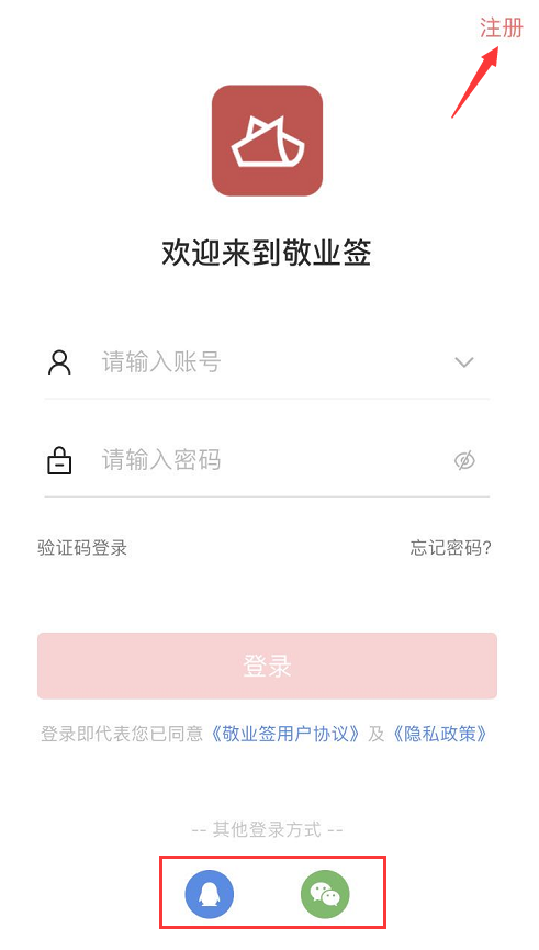 一、打开手机上已经安装好的敬业便签,点击界面顶部的“注册”,注册一个敬业签账号即可登录使用,或者可使用QQ、微信互联快捷登录。