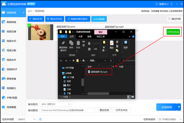 四、接着,就可以点击【打开文件夹】找到转换好的视频文件了。观察文件的后缀名,可以看到视频文件格式已经转换成功了。