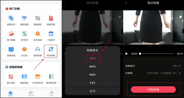 打开”微商视频助手“APP,点击【热门功能】中的【格式转换】。接着把要转换的视频添加进去,选择转换格式为mp4格式。最后就点击【开始转换】就完成了。