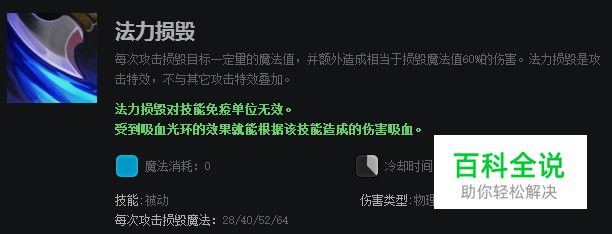 法力损毁是个被动技能,在敌法师普通攻击的时候燃烧敌方的法力值并造成比例伤害。