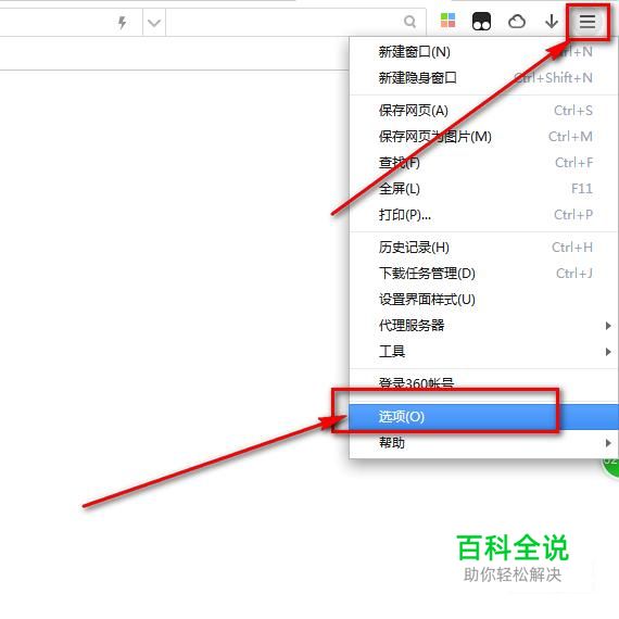 首先,打开浏览器,这里我就以360极速浏览器为例。打开之后,点击右上角的菜单图标,然后点击“选项”。