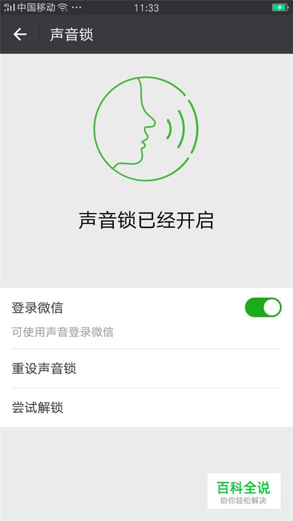 之后我们进入声音验证通过的界面,证明声音锁可以使用,我们点击“完成”即可,我们就设置微信加密成功,以后使用微信更加安全,如图所示。大家按照小编的方法,即可设置微信加密。