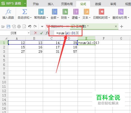 然后在编辑栏输入公式=sum(A1:D1)。这个公式的意思就是求A1单元格到D1单元格之间的数据的和。