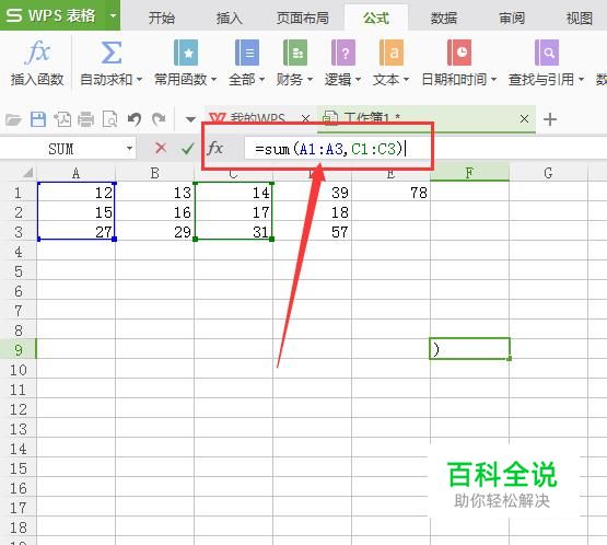 接着随便定位一个空白单元格,然后在编辑栏输入公式=sum(A1:A3,C1:C3)。