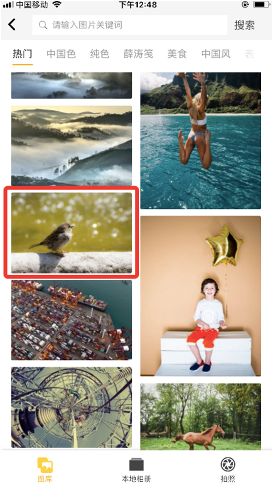 在图片库选择图片,可以使用图曰图片库的图片,也可以使用自己本地相册的图片!