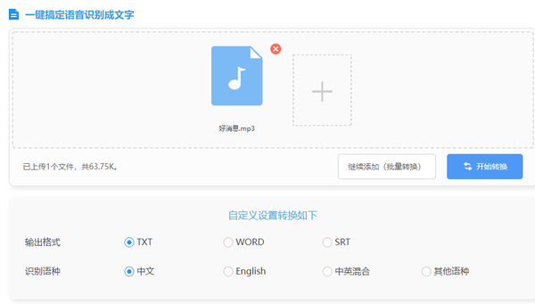 上传语音之后,选择语种,点击开始转换即可