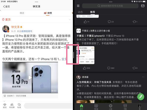 2、拖动应用之间的分隔按钮即可调整分屏大小。