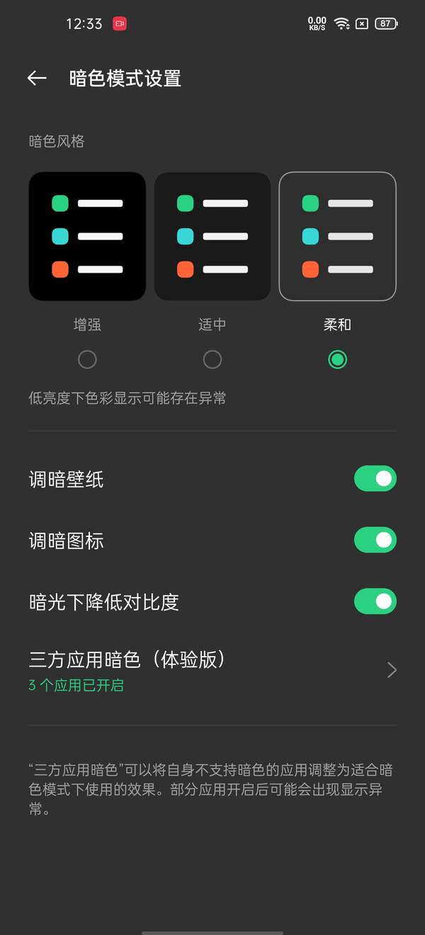 目前的大多数厂商的暗色模式为全黑显示,但对于小雷来说增强模式的全黑界面在拖动画面时的拖影实在是无法接受(由于OLED屏黑色不发光),而ColorOS 11则是通过调节对比度带来不同强度的暗色模式,其中柔和模式的灰黑色十分符合小雷自身的使用习惯,既起到了保护视力(疑似)的作用,又不会影响到日常的实际体验。