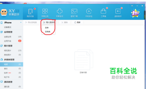 演示一下,就拿导入视频为例,鼠标点击视频,进入视频界面后,点导入视频,选择文件或者文件夹(选择文件是导入一个视频,选择文件夹是一次性导入多个视频),找到电脑上你要同步的视频,选中,然后确定,等待导入,成功,OK