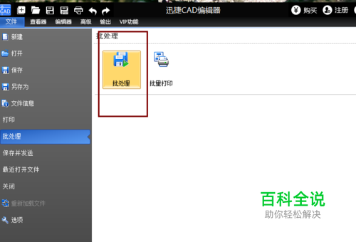 软件打开之后,点击软件的左上角第一个功能文件,点击之后会出现下拉菜单,然后点击批处理。