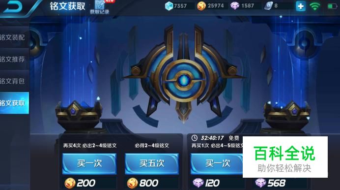进入“铭文界面”后,点击左边“铭文获取”,可以选择用金币或者钻石购买铭文,但是买到的铭文是随机的。
