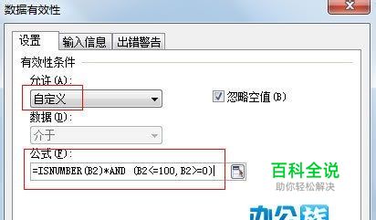 在数据有效性界面点击设置选项卡,在允许下方选择自定义,公式栏输入=ISNUMBER(B2)*AND (B2<=100,B2>=0)。