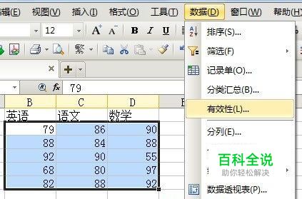 打开WPS 表格,打开要进行添加提示的表格文稿,以下图为例,鼠标选中B2:B6单元格,点击菜单栏数据--有效性。