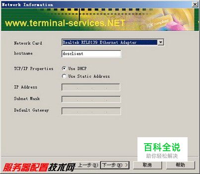 第3步,在打开的Network Information(网络信息)对话框中需要进行相关的网络设置,其中包括选择网卡类型、设置工作站主机名和设置TCP/IP属性。 首先在Network Card(网卡)下拉菜单中选择工作站的网卡类型(本例的网卡类型为Realtek RTL8139 Ethernet Adapter),然后在hostname(主机名)编辑框中设置工作站名称,默认主机名为dosclient,在TCP/IP Properties(TCP/IP属性)区域保持选中“Use DHCP(使用DHCP服务器分配)”单选框的选中状态。单击“下一步”按钮,如图2008122220所示。 图2008122220 设置网络信息 小提示:如果服务器端没有配置过DHCP服务器,则需要在TCP/IP Properties(TCP/IP属性)区域选中Use Static Address(使用静态地址),并进行相关配置。