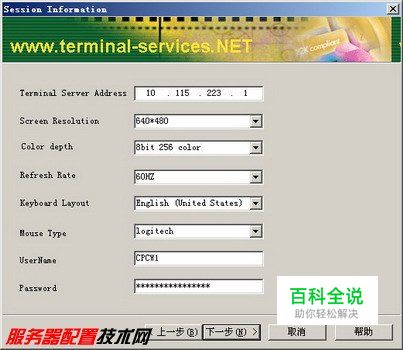 第4步,打开Session Information(会话信息)对话框,在该对话框中可以设置建立终端会话所需要的信息。在Terminal Server Address(终端服务器地址)编辑框中输入终端服务器(即Windows Server 2003服务器)的IP地址;Screen Resolution(工作站屏幕分辨率)、Color Depth(工作站色深)、Refresh Rate(工作站屏幕刷新速度)、Keyboard layout(键盘布局)和Mouse Type(鼠标类型)保持默认参数;最后在UserName(用户名)和Password(密码)编辑框中输入终端用户的名称和密码。单击“下一步”按钮,如图2008122221所示。 图2008122221 设置会话信息