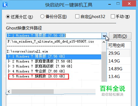进入PE系统桌面后,便可以看到一个快启动一键装机工具窗口,然后点击“浏览”按钮,到u盘目录下,将此前准备好的后缀名为iso的系统镜像包添加进来即可。随后在下拉菜单中选择一个版本进行安装,如下图所示: