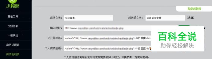 设置文字形式的链接方法有很多,但是这里推荐更简单的办法,一键生成文字超链接。打开小蚂蚁编辑器的营销工具——微信超链接,按照图片中的格式进行设置,点击生成。超链文字将会变成可以点击的蓝色文字,点击可以进行跳转。点击公众号超链右侧的复制按钮,将链接复制下来。