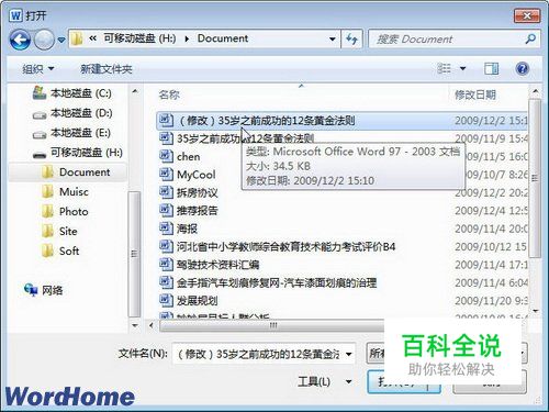 第2步,在打开的“打开”对话框中,选中需要打开的Word文档并单击“打开”按钮即可,如图2009120507所示。图2009120507 在“打开”对话框打开Word文档