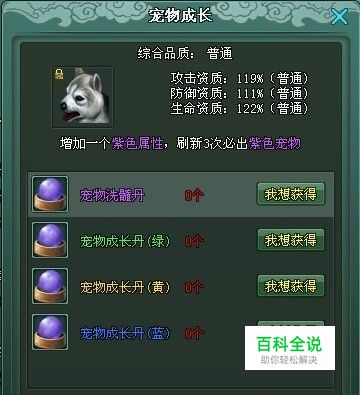 宠物提升品质则需要服用宠物成长丹。宠物成长丹可以通过挑战伯乐密室副本获得,也可以通过在随身商店购买虎符击败高级士兵获得,神秘商店还会出售各种品质的成长丹。拥有成长丹后,玩家就可以打开宠物界面选择“成长”对宠物进行刷新了。宠物成长丹品质越高,刷出高品质宠物的概率越高。而想要获得极品紫宠,则需要服用宠物洗髓丹,洗髓丹商店价4锭,有一定机会刷出紫色宠物。在宠物刷成紫色之后,还可以继续用洗髓丹刷新宠物的闪避和爆击属性!