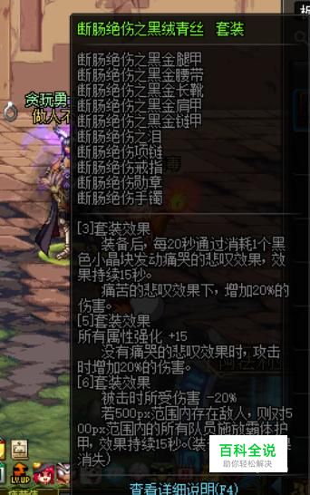 对于身上的防具我们首选的的远古套装为断肠绝伤套装,每件不仅可以附加光环效果,六件套还能为队友附加霸体。