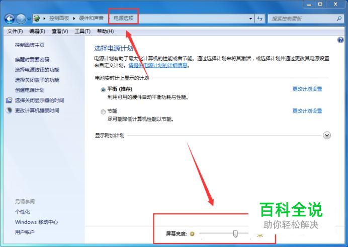 屏幕亮度 返回到【电源选项】窗口,在页面中找到【屏幕亮度】,移动砝码也可以调整电脑屏幕的亮度。
