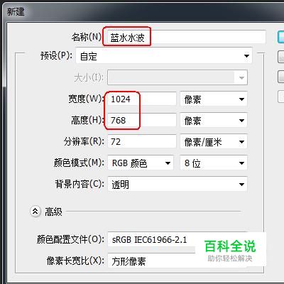 菜单栏:“文件”-“新建” 名称设置为“蓝色水波”,宽高粉笔设置为“1024和768像素”