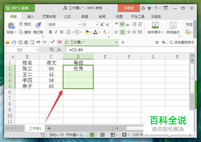 这里我们的目的是将90分以上的同学标注出来,并将其标注为优秀。在单元格中输入“=c2-89”(c2符号直接点击c2单元格即可),点击回车键确认,如图所示: