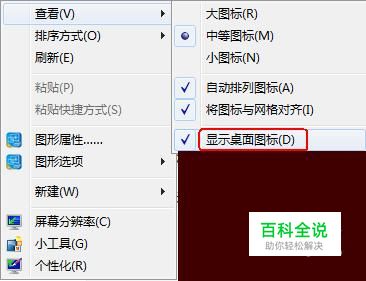 选择“查看”-看看“显示桌面图标”这一项是否勾选,没有则勾选;有则看第二种方法。