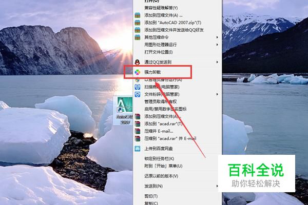 首先鼠标右键点击CAD软件,然后我们再点击功能列表中的“强力卸载”按键。