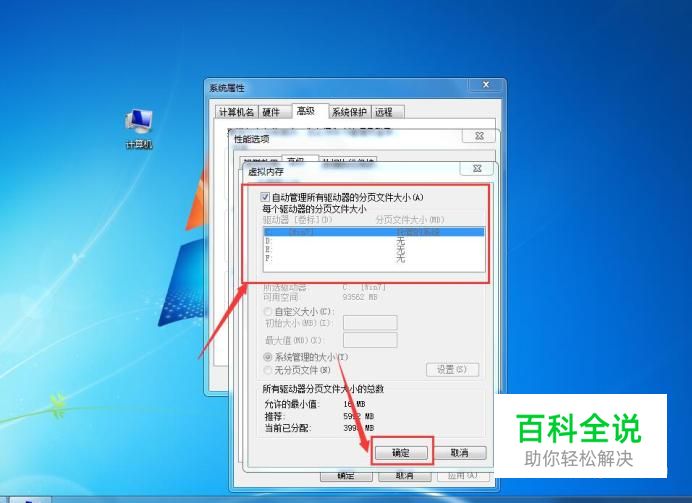 虚拟内存 会弹出【虚拟内存】窗口,可以在这里更改虚拟内存,更改完成之后,点击【确定】按钮,如下图所示。