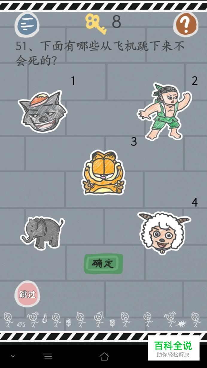 第五十一关:动画里的人物是摔不死的,所以答案是【灰太狼、葫芦娃、巧虎、喜羊羊】。