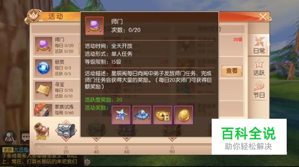 师门: 当玩家的九州天空城账号达到15级后就能领取师门任务了,每天前20轮的师门任务玩家可以获得大量的奖励,而且还能获得20点活跃度。