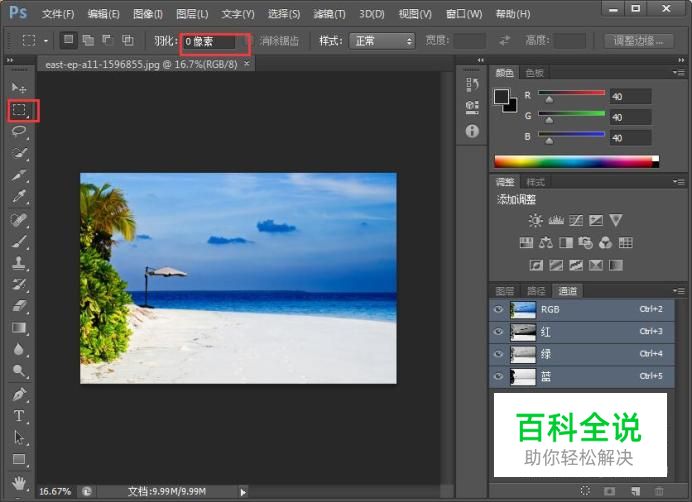 第一步: 选择工具箱中的【矩形选框工具】,将鼠标指针移动到选项栏中【羽化】后面的文本框里。