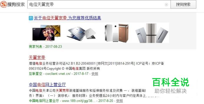 打开搜狗搜索,输入电信天翼宽带关键字,确认后查看搜索结果。
